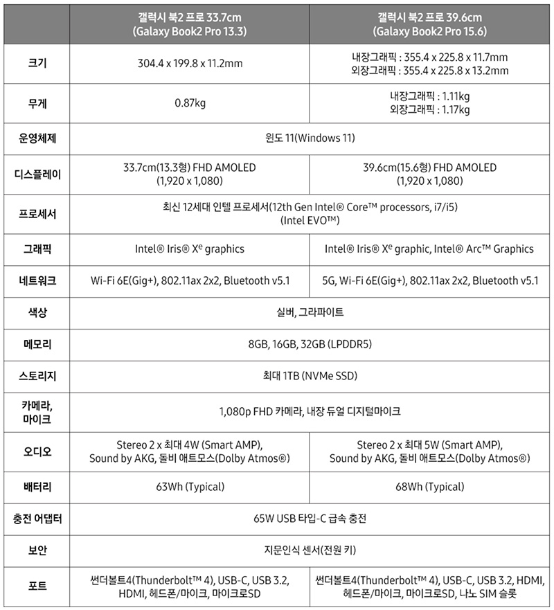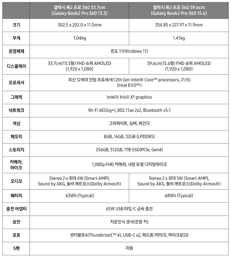 아래는 '갤럭시 북2 프로'의 스펙 입니다.