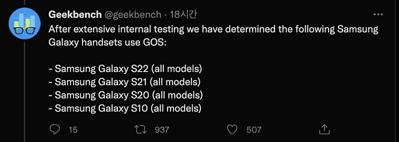 그리고 이번에 모바일 벤치마크로 유명한 긱벤치에서 자체 조사를 한 결과 GOS로 인한 벤치마크 치팅이라고 판단되어 일부 갤럭시 시리즈가 퇴출 되었습니다.