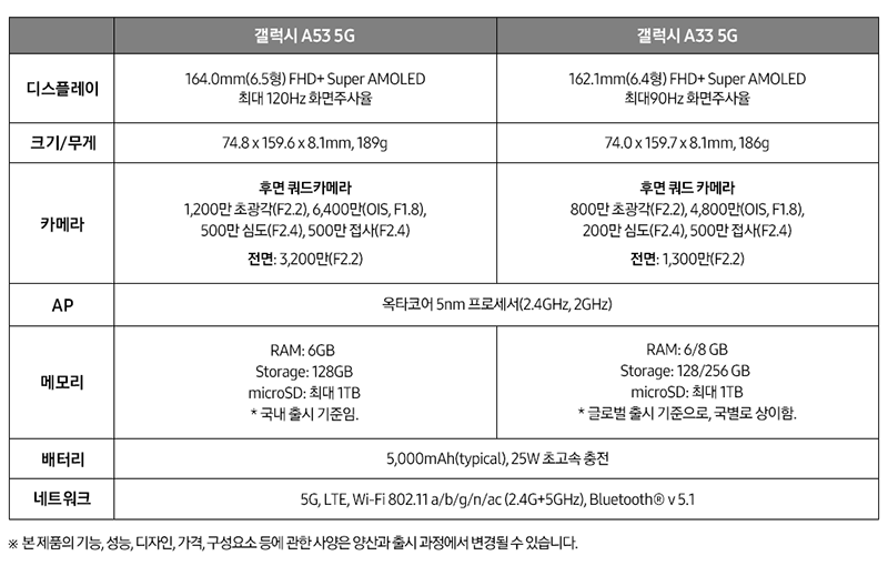 아래 이미지는 갤럭시 A53 5G, 갤럭시 A33 5G의 스펙입니다.