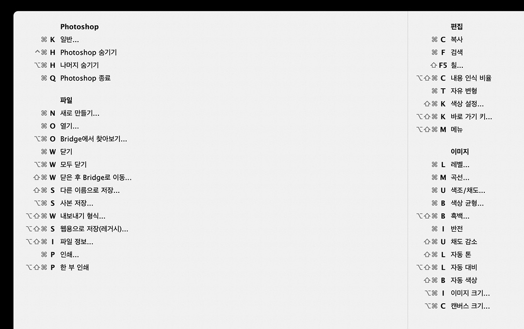 예를 들면 포토샵을 실행후 command 키를 길게 누르면 포토샵에서 사용하는 단축키를 아래처럼 보여주게 됩니다.