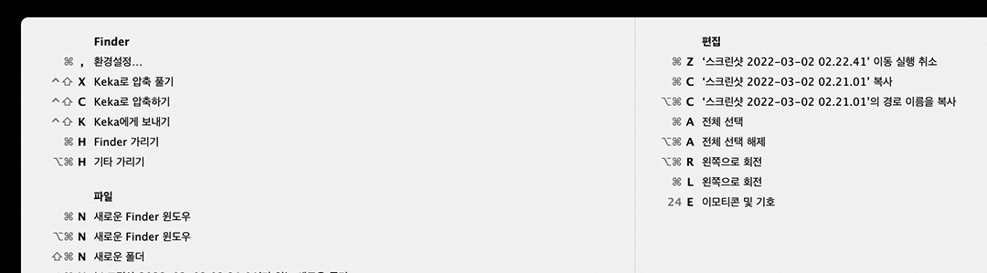 그래서 맥에서 사용하는 앱의 경우 단축키를 모두 한번에 보여주는 치트시트(CheatSheet)앱이 있습니다.