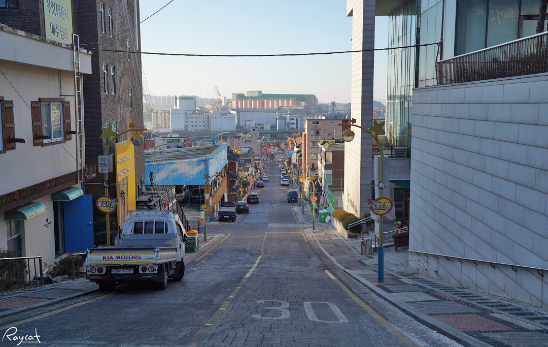 송월동 동화마을의 메인도로는 위 사진에 보이는 입구에서 쭉 올라오는 언덕길로 도보로 15분 정도면 올라올 수 있지만 실제로 다녀보면 골목 구석구석 다양한 이야기가 숨겨져 있어 메인도로를 따라 올라오며 골목길로 들어가서 한 바퀴 돌다 보면 꽤 시간이 소요됩니다.