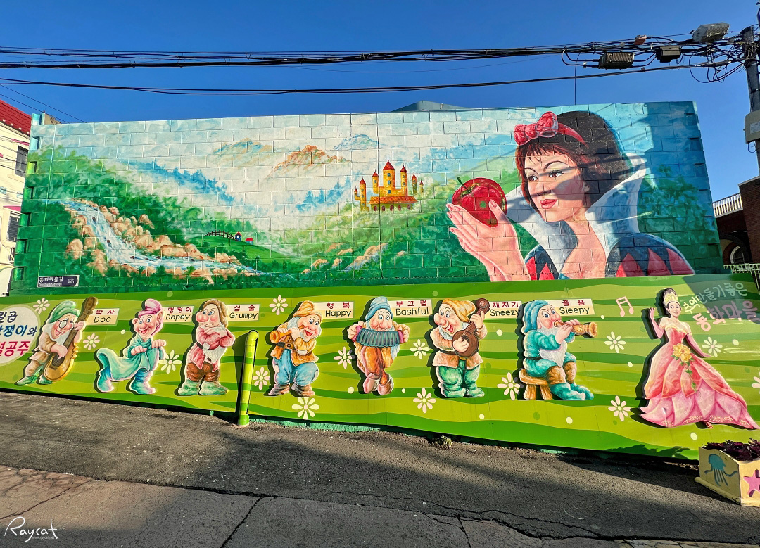 송월동 동화마을 담벼락에 그려진 백설공주와 일곱 난쟁이 벽화