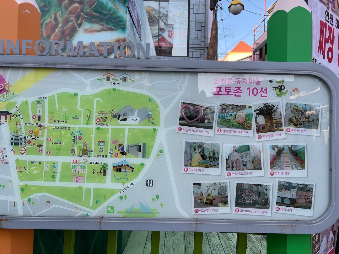 인천 차이나 타운과 가까운 거리에 있어서 송월동 동화마을은 데이트하기도 좋은 곳이며 아이들에게 동화책 읽어주듯 벽화를 따라 걷기도 좋아 아이들과 함께 나들이하기도 괜찮은 곳인데 주말은 골목길이 좀 복잡해지는 곳이기도 합니다.