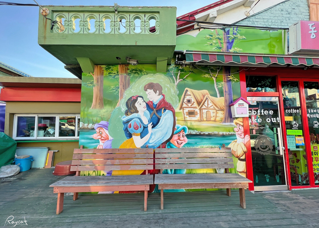 카페 앞에는 백설공주 이야기 포토존이 있어서 카페 앞에서 사진도 촬영하고 카페에 들어가 커피도 한잔하며 잠깐 쉬어갈 수 있는 분위기로 만들어 이곳에서 장사하는 사람들에게 도움을 주고 있습니다.