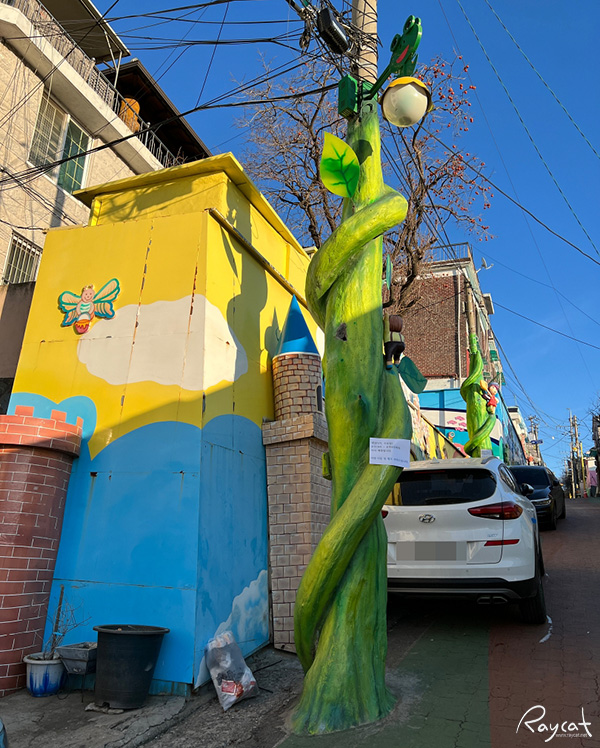 단순히 가옥에 벽화만 그려둔 게 아니라 이곳은 전봇대나 벽에 조형물까지 설치해 동화마을이란 이름답게 그 분위기를 더해주고 있습니다.