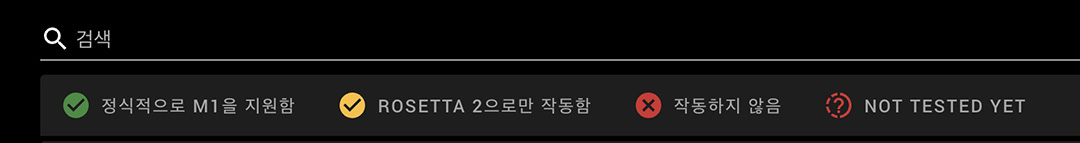 앱 이름을 검색해 보면 바로 사용하는 앱이 맥 M1 칩을 지원하는지 로제타2로만 작동하는지 볼 수 있으며 일부 충돌이 있는지 확인해 볼 수 있습니다.