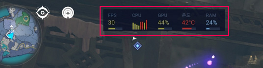 그리고 다시 30분 후 발열을 보면 42도로 숫자가 빨갛게 변했음을 볼 수 있는데 온도가 높다는 의미로 프레임이나 램 사용율은 변화가 없지만 온도가 꽤 올라갔음을 알 수 있습니다.