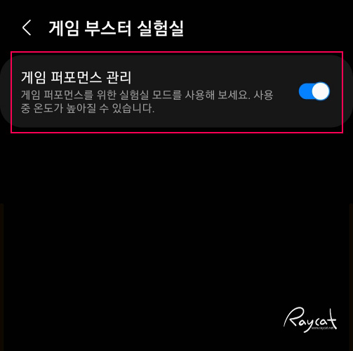 단 메시지를 보면 게임 퍼포먼스 관리를 켜게 되면 스마트폰 사용 중 온도가 높아질 수 있다는 경고가 있습니다. 실제 그래서 게임을 하며 한번 테스트를 해봤습니다.