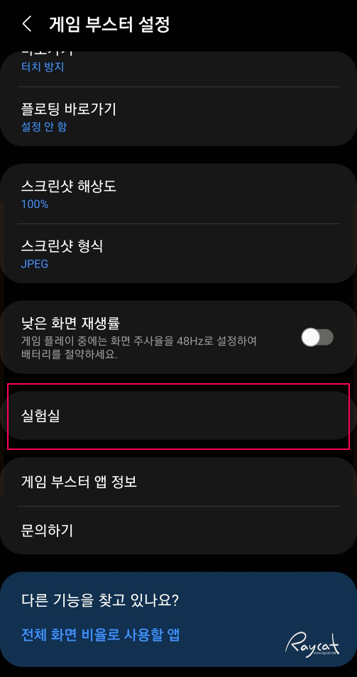 게임 부스터 설정에 보면 실험실이 있습니다. 자 이제 다른 건 건드리지 말고 그냥 바로 실험실로 들어갑니다.