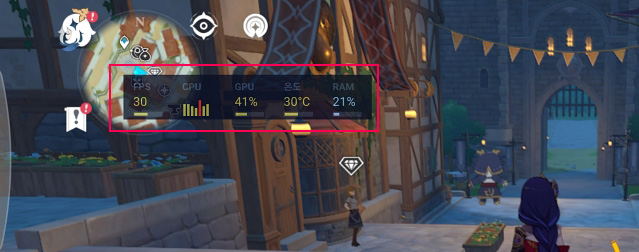 GOS를 끄면 확실히 발열은 있지만 프레임은 계속 30 프레임을 유지해주고 발열은 평소보다 높고 램 점유율은 비슷한 수준입니다.