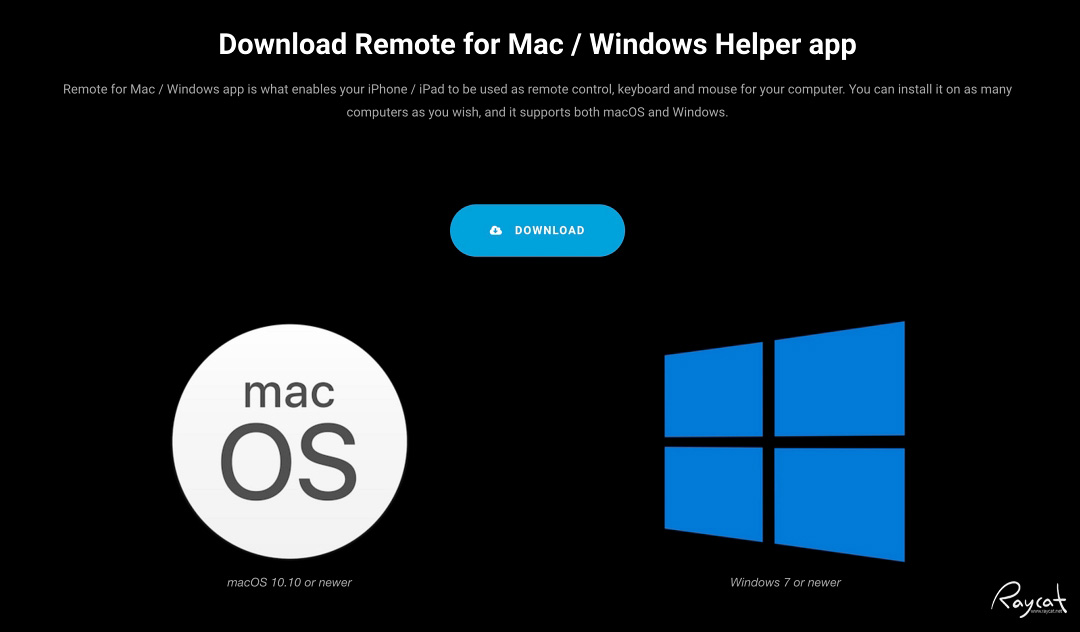 앱스토어에서 앱을 다운로드해 실행하면 맥이나 PC에 클라이언트용 애플리케이션을 다운로드 웹 주소를 팝업 합니다. Remote Control for computer앱과 함께 사용할 맥이나 PC에 맞춰 이 프로그램을 다운로드 후 설치하면 됩니다.