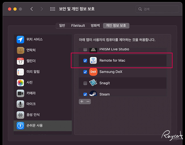 권한 설정을 클라이언트 프로그램 설치후 설정 -> 보안 및 개인 정보 보호 -> 손쉬운 사용 -> 개인 정보 보호 -> Remote for Mac을 체크해줘야 합니다. 자 이제 아이폰에서 앱을 실행해 맥과 연결합니다.