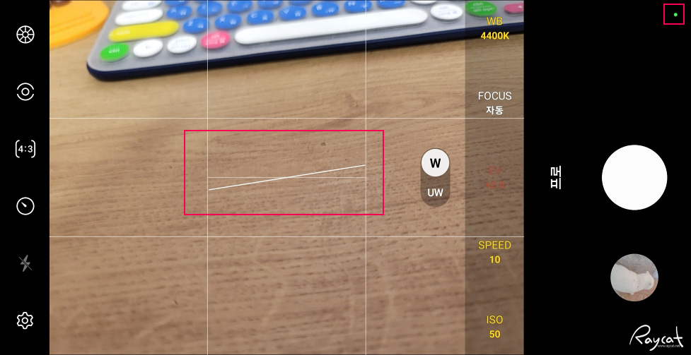 카메라 기능을 사용할 경우 화면 오른쪽에 녹색점 led로 표시되며 카메라 모드에서 프로 모드로 전환하면 사진이나 동영상 촬영 시 화면의 중앙에 저렇게 수평계가 나옵니다. 영상이나 사진 모두 프로 모드에서만 수평계가 나오며 선이 가늘어서 잘 안 보이는 게 좀 아쉽습니다.