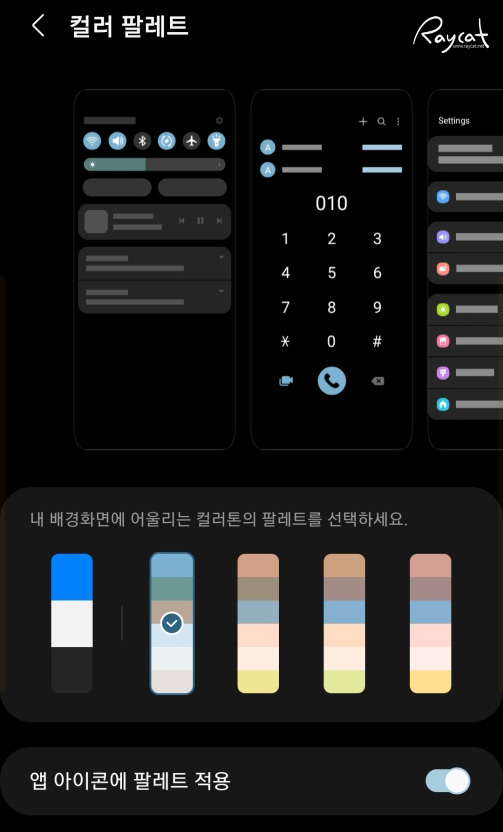 기존 원ui 4.0에서 처음 선보인 컬러 팔레트가 배경화면뿐 아니라 구글 제공 앱까지 맞춤 컬러 팔레트를 지원하는 앱이 더 추가되었습니다.