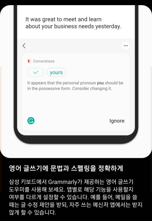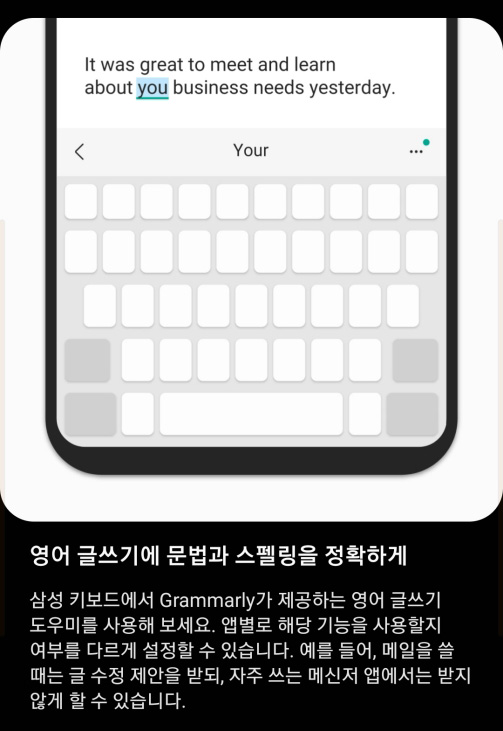 갤럭시 스마트폰에서 삼성 키보드를 사용하며 영어를 많이 사용한다면 유용할 수 있는 기능인데 영어 글쓰기 도우미를 활용하면 문법과 스펠링을 체크해 주는 기능이 추가되었습니다. 삼성 키보드로 영어를 많이 사용하는 분이라면 꽤 편할 것 같습니다.