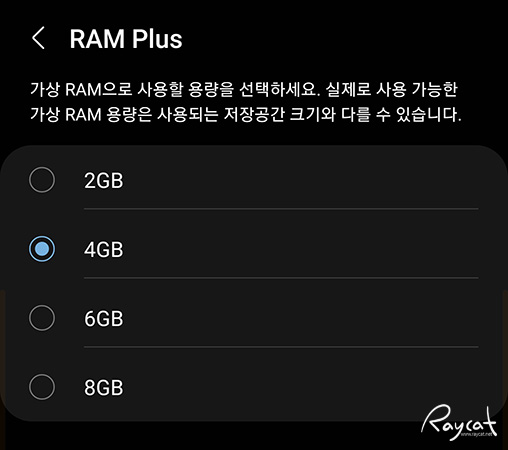 RAM Plus의 경우 기본은 4GB로 지정되어 있으며 8GB까지 사용할 수 있습니다. 기기의 저장공간을 공유하기 때문에 램플러스에서 지정된 용량만큼 저장공간을 차지하게 됩니다.