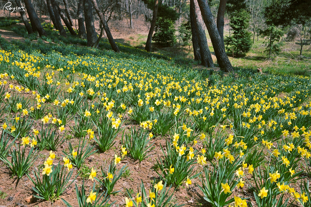 활짝 핀 수선화가 온산을 노랗게 물들이고 있는데 지금 이곳의 수선화는 90% 정도 개화했다. 햇빛이 잘 비추지 않는 산 중턱의 그늘진 곳과 소나무 숲 사이에 있는 수선화들만 조금 개화가 늦을 뿐이다.