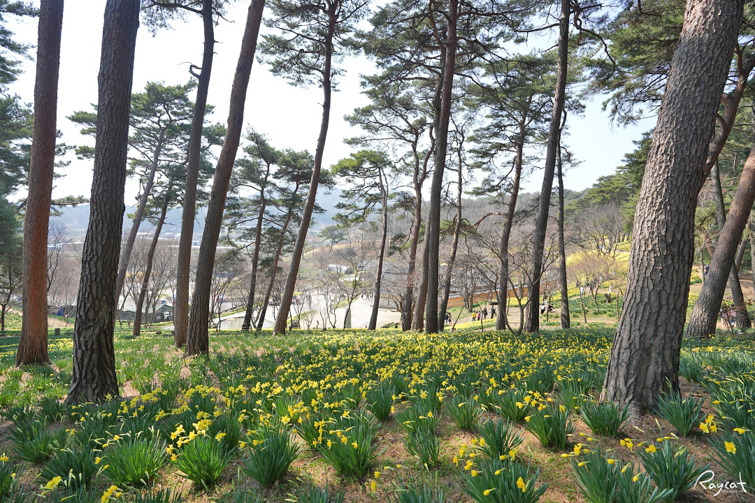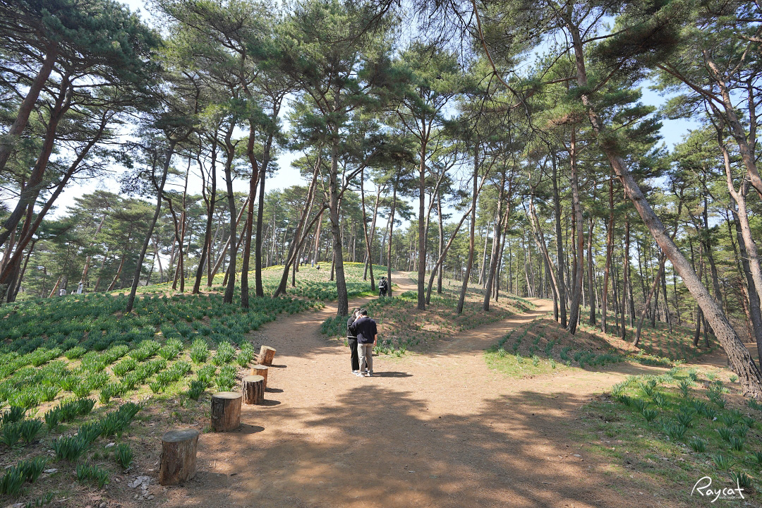 3월과 4월 봄이 시작하는 시기면 볼 수 있는 풍경으로 산을 한바퀴 돌아 수선화가 송림 사이에 군락지를 이루고 있다.