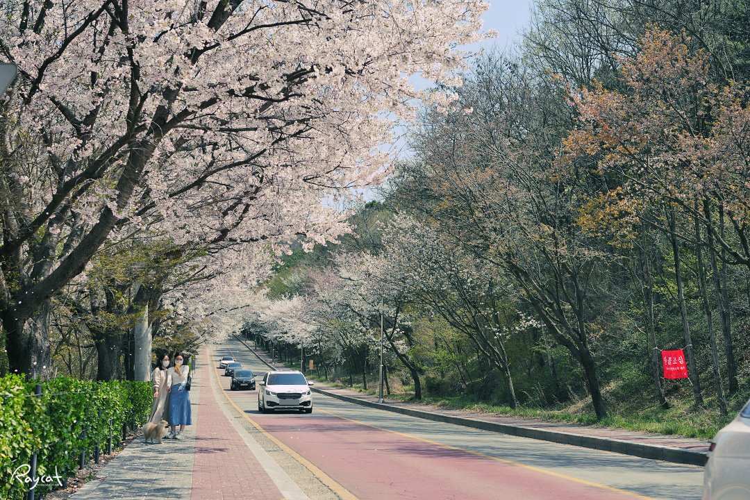 이곳 도로는 호수를 한 바퀴 돌며 벚나무가 4월 초부터 시작해서 중순까지 꽃구경을 하기 좋은 곳이다.