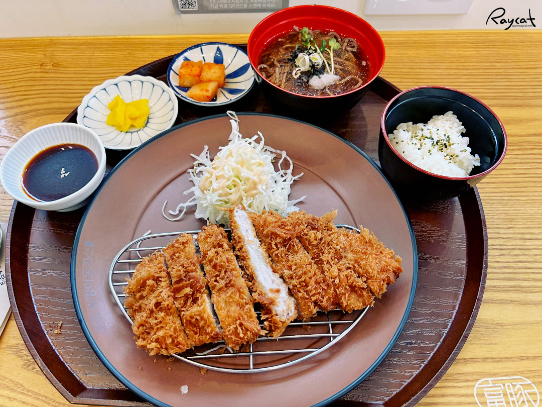 키오스크에서 기본 돈가스 정식을 주문하고 번호표를 받고 조금 기다리니 주문한 메뉴가 나옵니다. 기본 돈가스 정식의 구성은 돈가스(등심), 단무지, 깍두기, 밥, 메밀소바가 나옵니다.