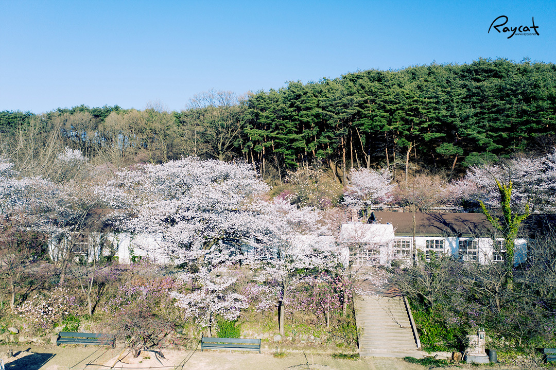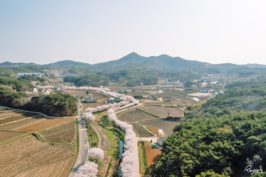 이 길은 드론으로 하늘에서 보면 더 예쁘게 보이는 도로이며 벚나무가 쭉 이어져 나무에 팝콘이 터진 느낌을 줍니다.