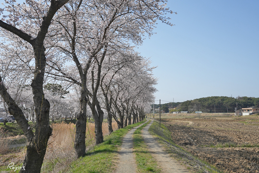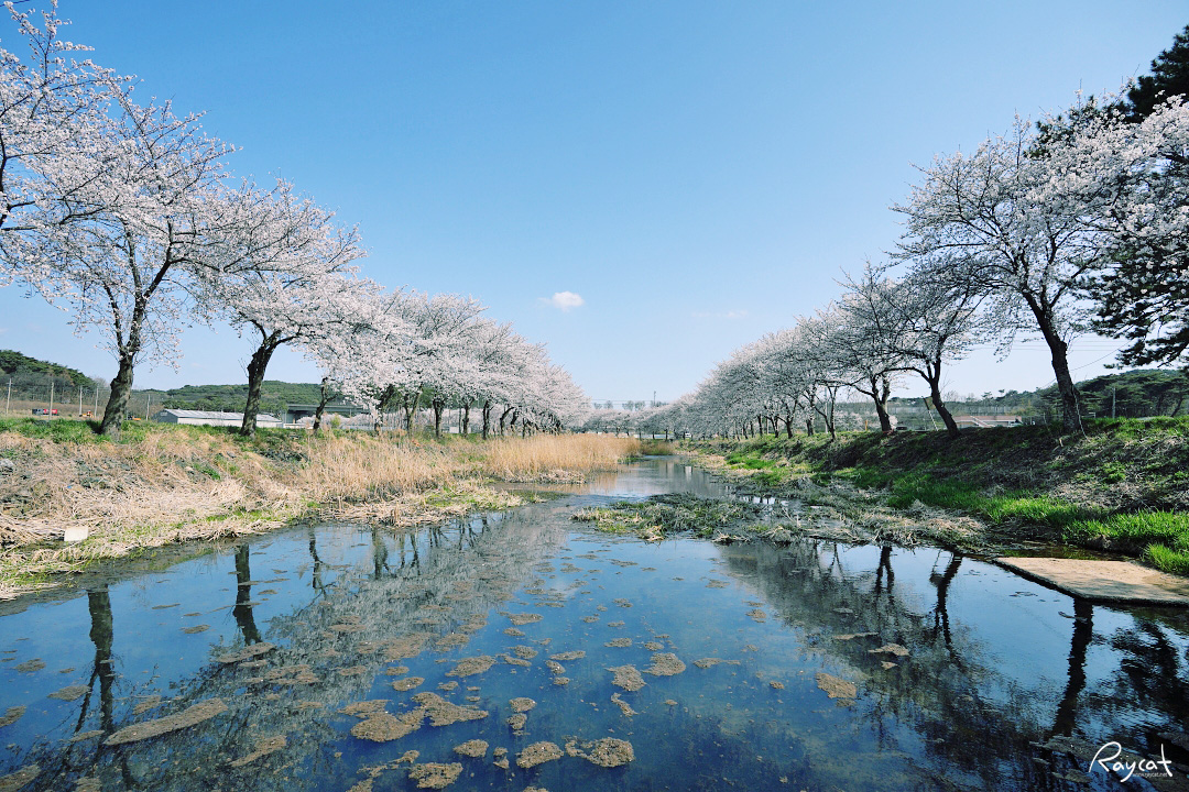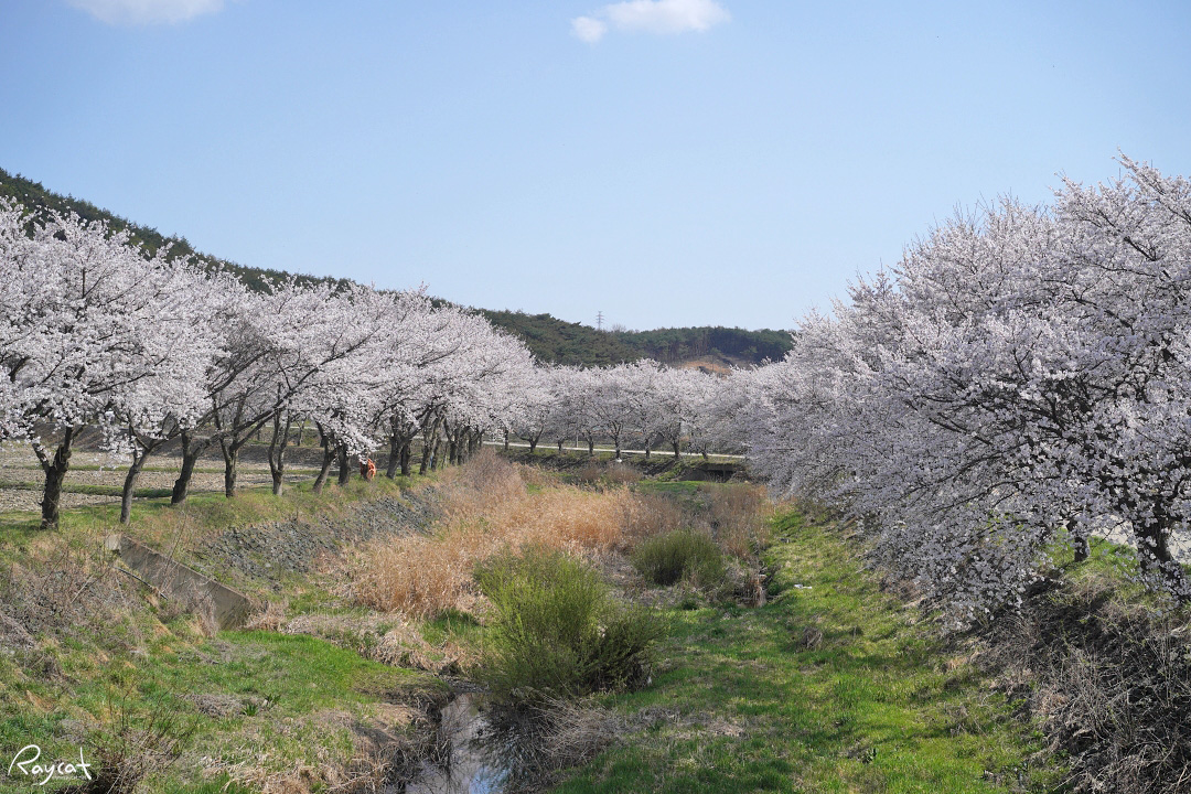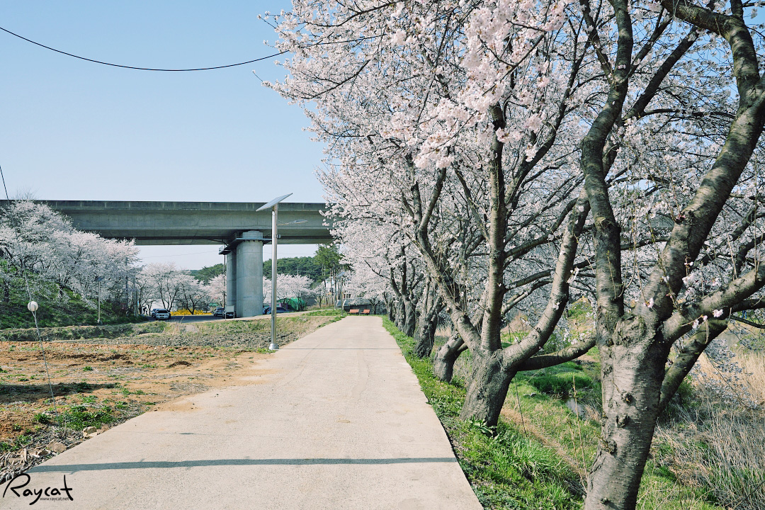 하천을 중심으로 이어지는 이곳의 벚꽃나무길은 한쪽은 포장도로 한쪽은 농로로 이어져 있어 한쪽 도로는 차와 자전거로 드라이브할 수 있으며 농로와 이어지는 구간은 두 사람 정도 나란히 서서 걸을 수 있습니다.