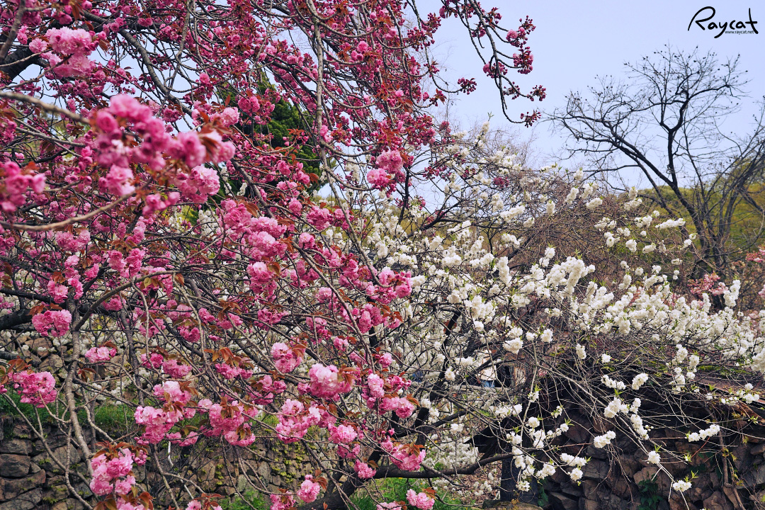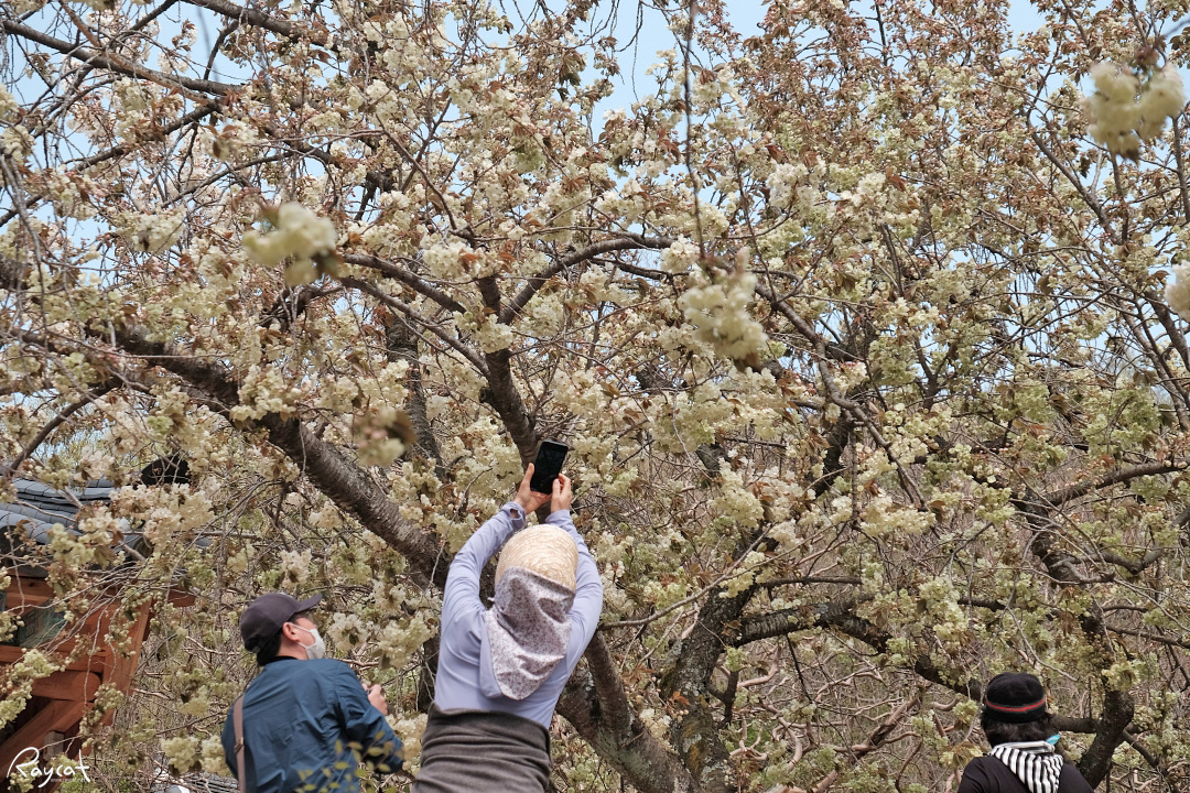사찰 주변에 있는 왕벚나무, 겹벚꽃 그리고 이곳에서 가장 유명한 청벚꽃이 이제야 개화를 시작했다.