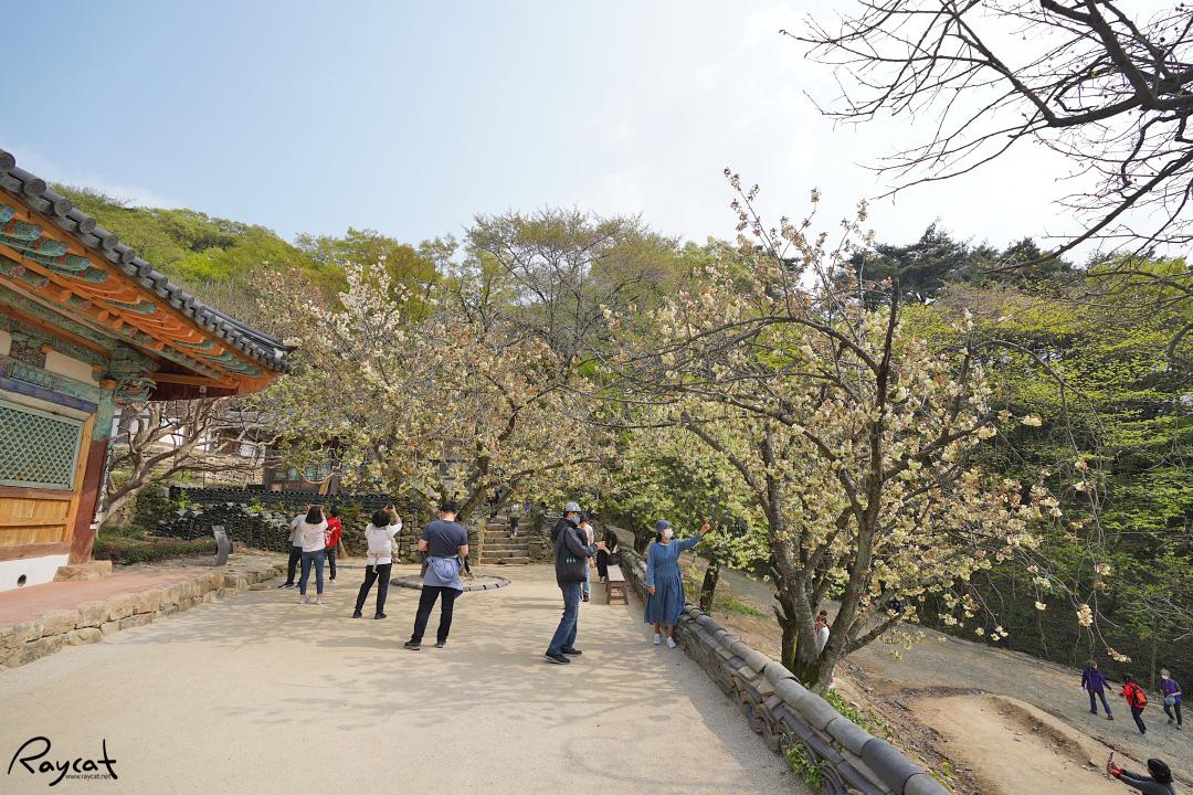 사찰 주변에 있는 왕벚나무, 겹벚꽃 그리고 이곳에서 가장 유명한 청벚꽃이 이제야 개화를 시작했다.