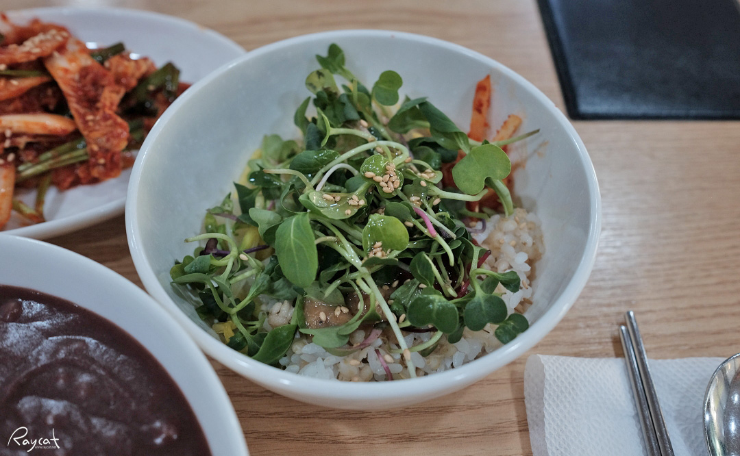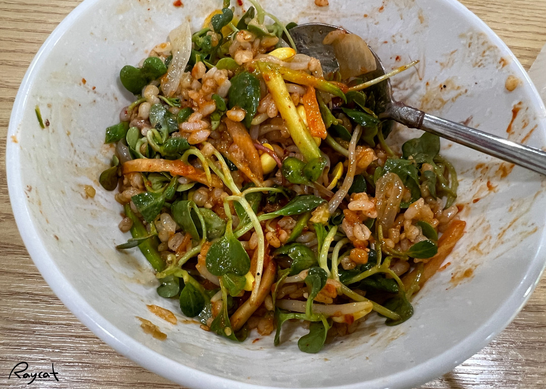 팥죽과 함께 서비스로 나오는 맛보기 보리비빔밭 각종 나물과 함께 비벼 먹으면 이것도 이 집의 팥죽만큼은 아니지만 꽤 맛있다.