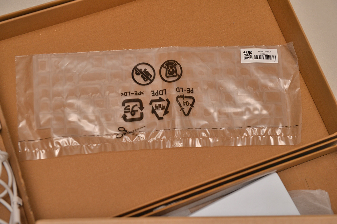 기본 구성품은 전원 어댑터와 키스킨이 있으며 어댑터 크기가 이전보다 커졌습니다.