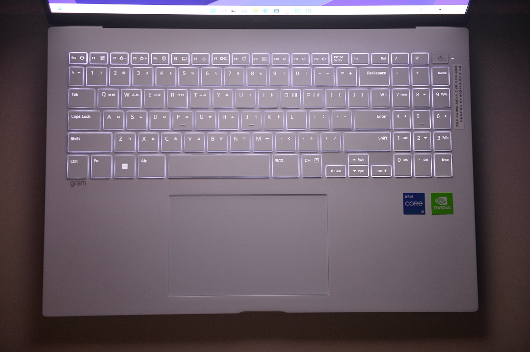 키보드 배열은 이전과 동일하며 밝기 조절이 가능한 백라이트가 있습니다. 위 사진은 키보드 백라이트를 최대 밝기로 켰을때입니다.