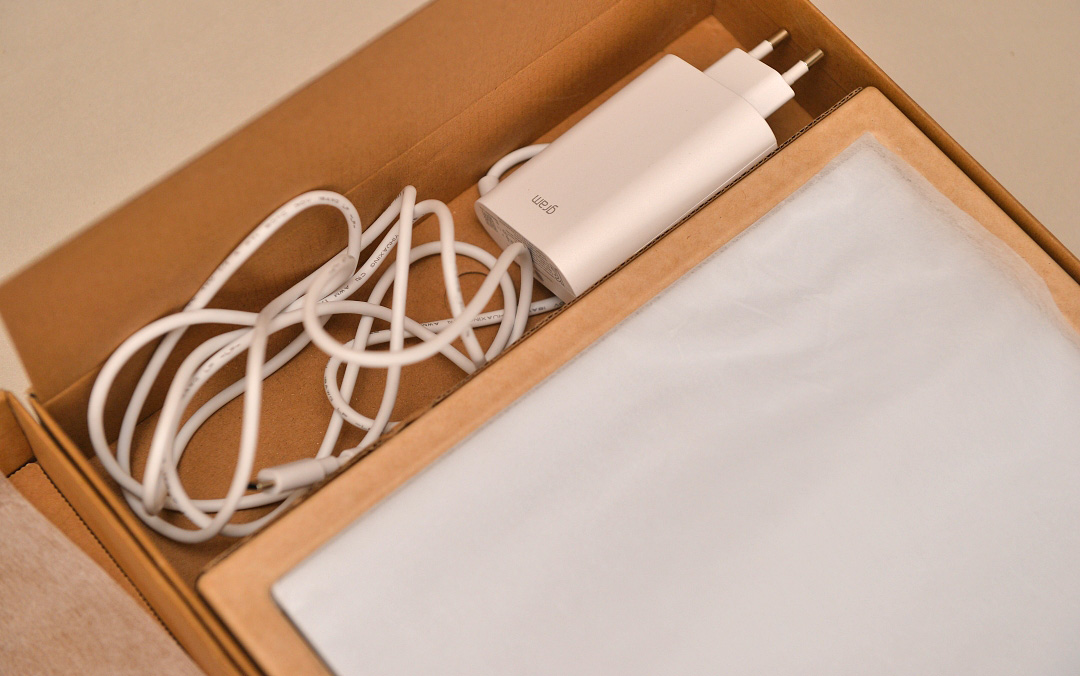 먼저 뷰를 언박싱 해보면 박스 포장재에 탁상 달력을 만들 수 있도록 제공해주고 있는데 뷰에 있는 구성품은 간단합니다. USB-C to USB-C 케이블과 함께 간단한 보증서 겸 사용설명서, 폴리오 케이스가 포함되어 있습니다.