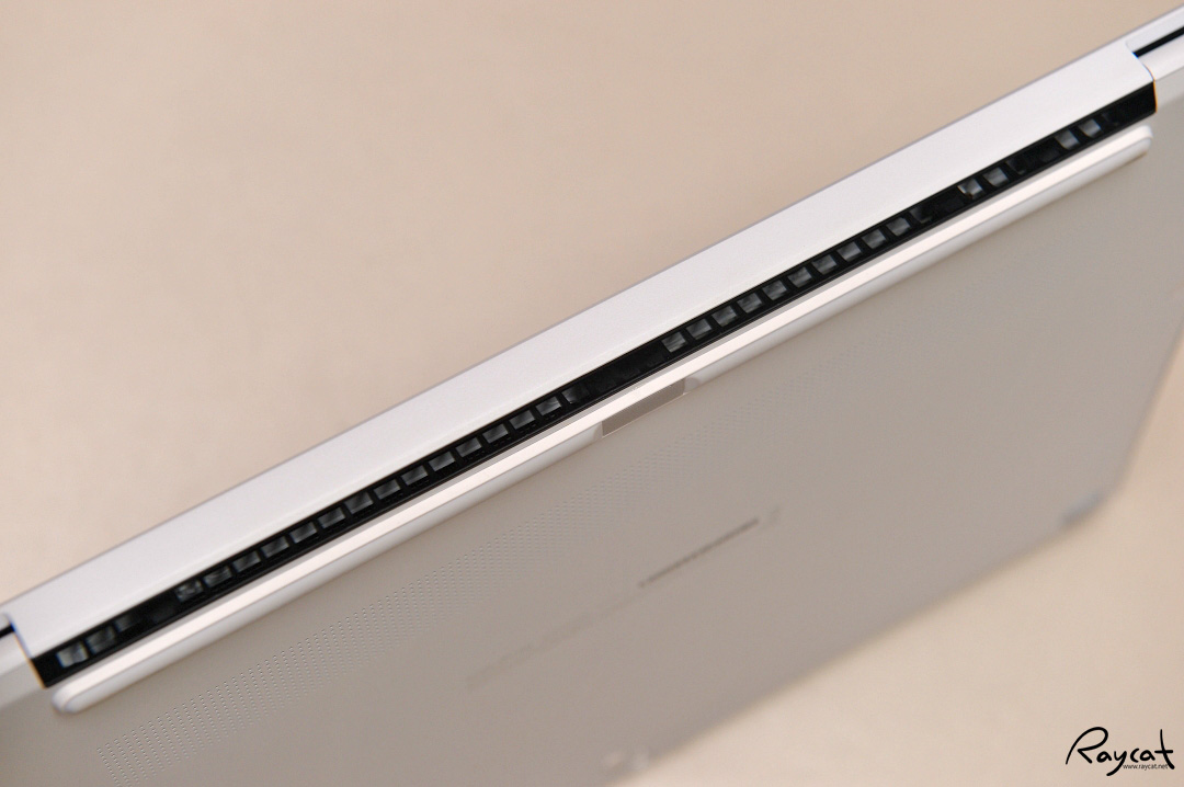 바닥면을 보면 양쪽 사이드에 스피커가 있고 힌지 아래쪽에 큰 열배출구가 있습니다. 네모서리 미끄럼 방지 고무가 있어서 바닥면이 직접 닿지는 않습니다.