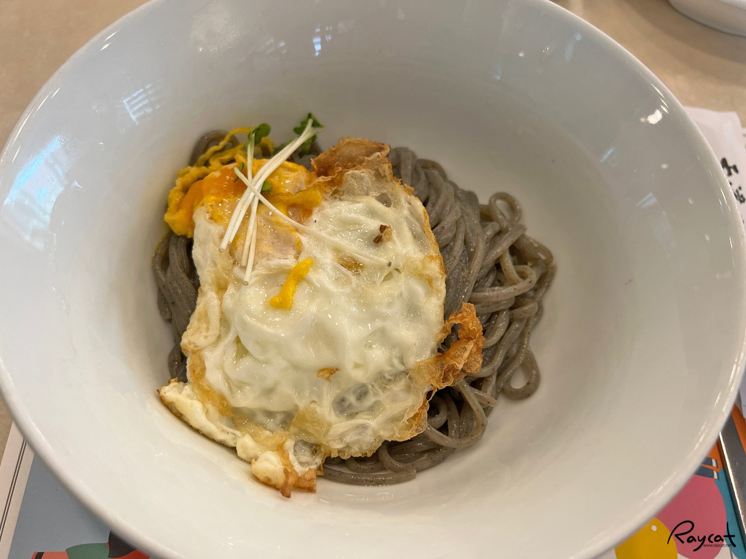 흑미면이 일반면과 다른게 좀 더 고소하고 쫄깃한 식감을 주는데 흑미면 위에 계란후라이를 하나 저렇게 얹어서 나온다.