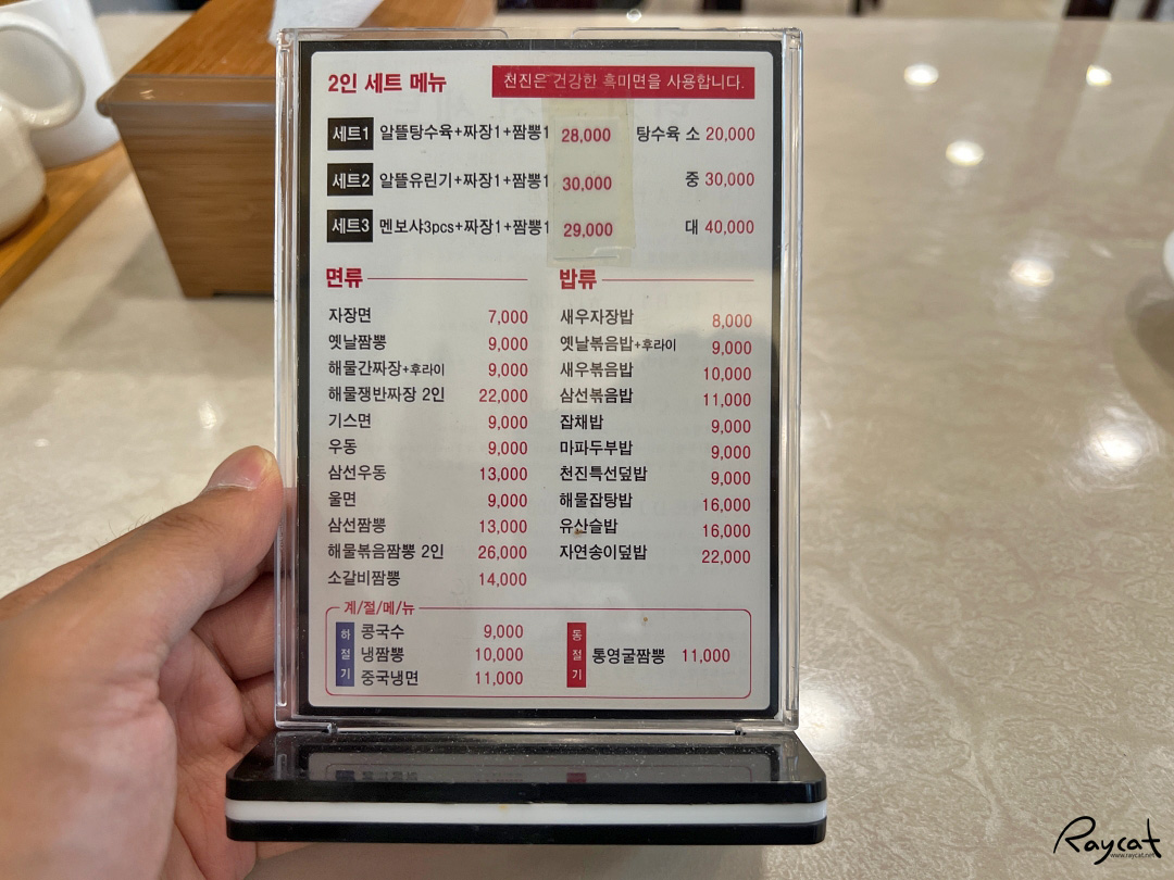 내부는 일반 중국집과 비슷하게 붉은색 장식이 많은편이고 홀이 꽤 넓다. 메뉴도 보통 중국집과 비슷하지만 늘 여기 오면 주문하는 건 해물간짜장 + 후라이다.