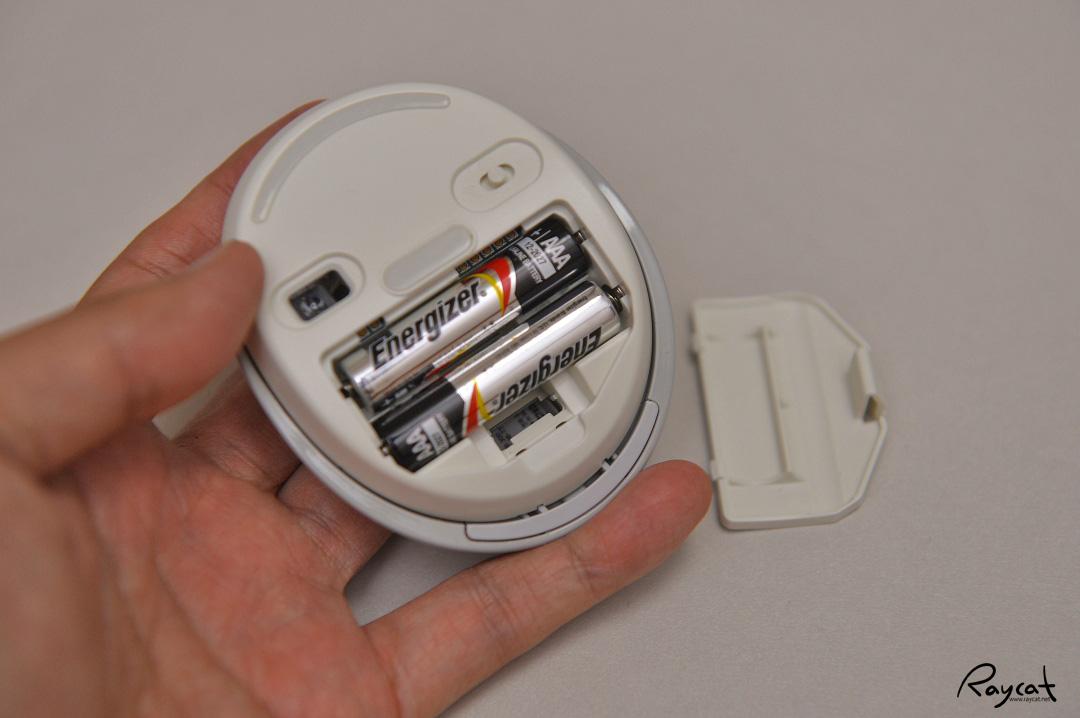 AAA 배터리 2개를 사용하고 바닥에 보면 스위치가 있으며 스위치는 중앙에 두고 사용하면 됩니다. 배터리 안쪽에 동글이를 끼워서 휴대하고 다닐수 있는 구조로 되어 있습니다.