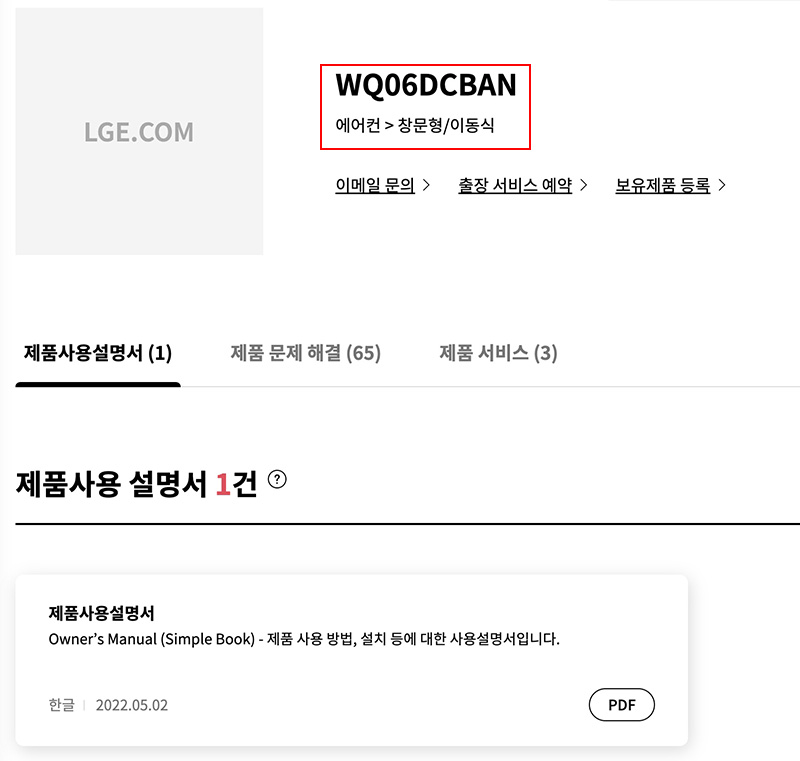 LG전자 서비스 홈페이지에 보면 제품별 문의 항목에 에어컨 - 창문형/이동식 에어컨 항목이 있으며 아래쪽에 제품 사용설명서가 있는데 이 PDF 설명서를 다운로드해보면 이동식 에어컨이 아닌 지금까지 보지 못했던 창호형 창문형 에어컨 설명서가 나옵니다.