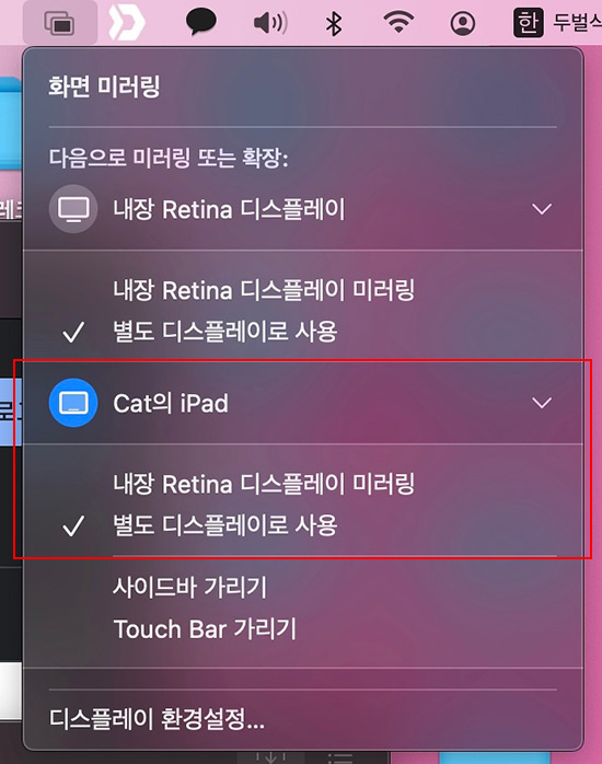 아이패드가 맥에 연결되면 위 캡처 이미지처럼 상단의 메뉴바에 2개의 사각형이 겹쳐서 나오는 아이콘을 눌러보면 맥과 연결된 디스플레이 정보가 나오며 메뉴에서 각각 설정을 변경할 수 있습니다.