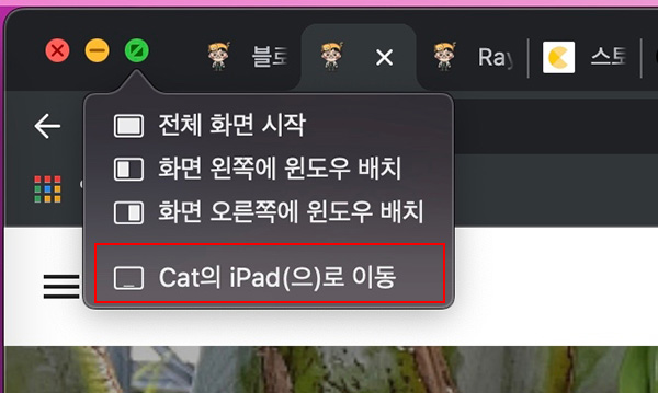 맥 데스크탑 앱 사용 중 브라우저의 확장 버튼에 마우스를 가져다 대면 위 캡처 화면처럼 아이패드로 이동할 수 있는 메뉴가 나옵니다.