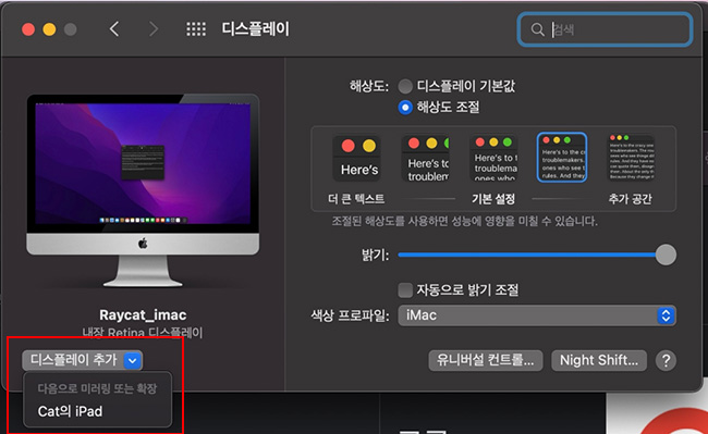 아이패드와 맥이 이중인증 되어있고 연결되어 같은 네트워크 안에 연결되어 있다면 디스플레이 설정에서 디스플레이 추가 보면 아이패드가 추가되었음을 확인할 수 있습니다.