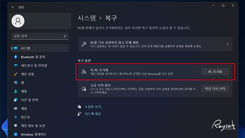 참고로 복구 메뉴가 안보이면 설정 검색에서 '초기화'로 검색하면 복구 메뉴가 보입니다.
