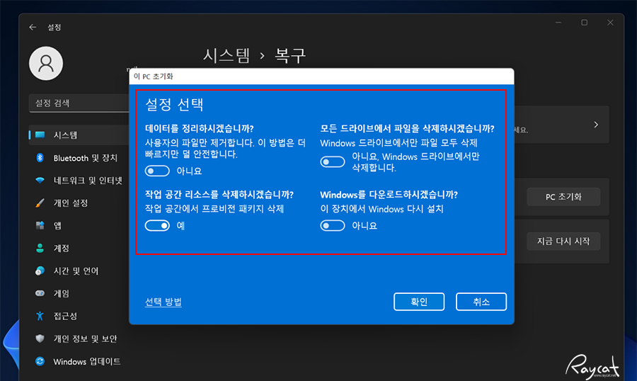 설정 선택을 다시 한번 확인하게 되는데 삭제되는 데이터와 윈도우 설치에 대해 한번 더 확인을 하게 됩니다. 공장 초기화를 원하는 것이라면 여기서 다른 선택없이 그냥 '확인'을 누르면 됩니다.