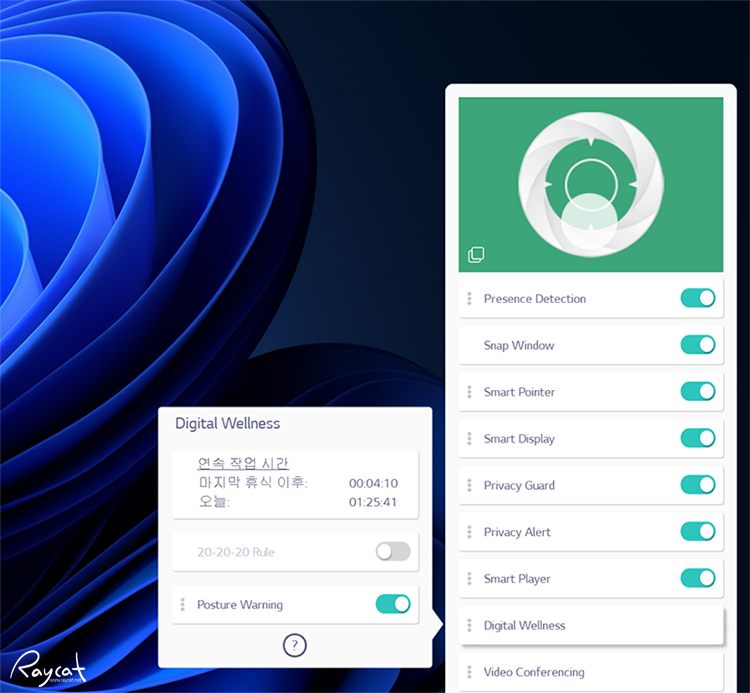 또 건강 기능인 Digital Wellness를 켜 두게 되면 노트북이 켜지고 작업한 시간을 측정해 일정 시간이 지나면 잠시 쉬라는 알림을 화면에 보냅니다. 그램에 탑재된 미라 매트릭스 글랜스 기능은 사용해보면 의외로 잘 작동하고 LG 그램 외에도 최신 레노버 노트북에도 이 기능이 탑재되어 있습니다.