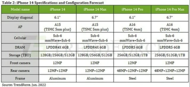 IT 매체인 트렌스포드에 올라온 아이폰14의 스펙을 보면 모두 6GB 램을 탑재했으며 4800만 화소의 카메라는 아이폰14 시리즈 중 프로 모델에만 탑재했음을 보여주고 있습니다.