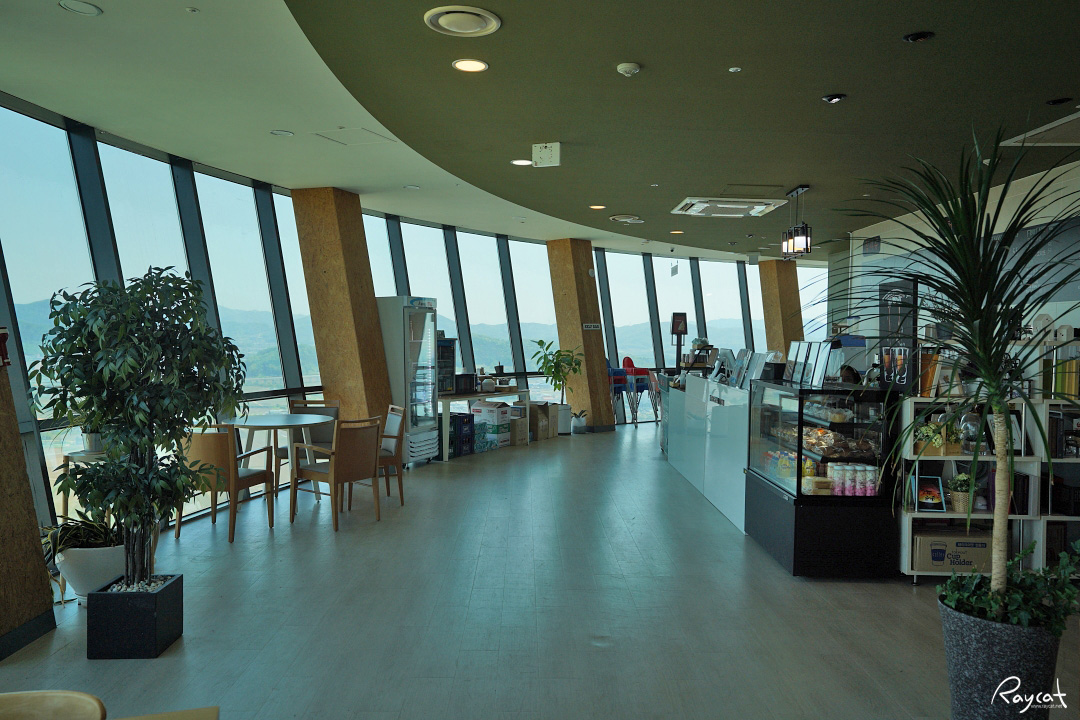 스카이뷰는 레스토랑과 카페가 있으며 360도로 아산 시내를 볼 수 있는데 창에 보면 아산의 유명 관광지의 거리가 표기되어 있으며 차를 타고 갈 수 있는 시간도 표기되어 있습니다.