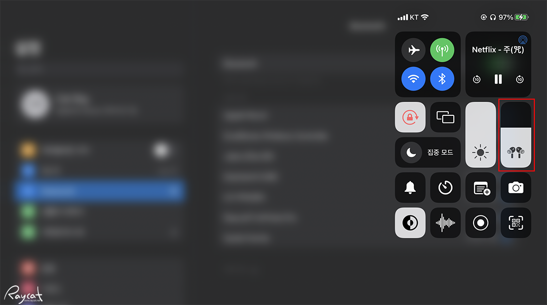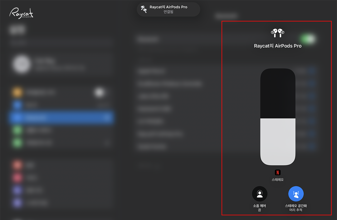 넷플릭스를 실행 후 제어센터에서 에어팟 프로를 터치하면 '스테레오 공간화 머리 추적'이 활성화 되어 있음을 확인할 수 있습니다.