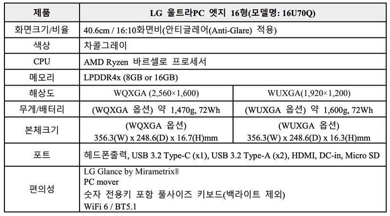 AMD의 최신 라이젠 바르셀로(Barcelo) 프로세서를 탑재해 메모리는 제품 사양에 따라 8GB와 16GB 중 하나를 선택할 수 있으며 얼굴 및 시선 감지 기술 기반을 활용한 미라매트릭스(LG Glance by Mirametrix®) 기능을 지원하고 있습니다.