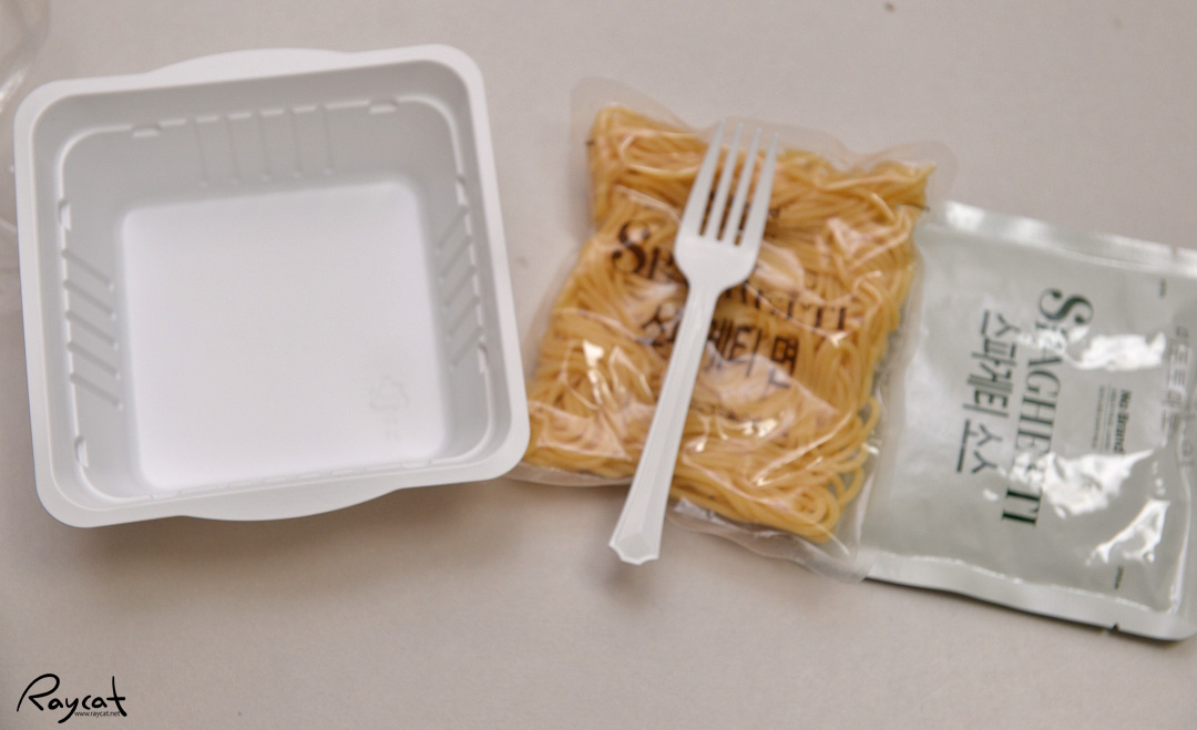 구성품은 간단하게 스파게티면과 스파게티 소스 그리고 포크가 있습니다. 스파게티면은 120g으로 양은 적은 편인데 여성한테는 어떨지 모르겠습니다.