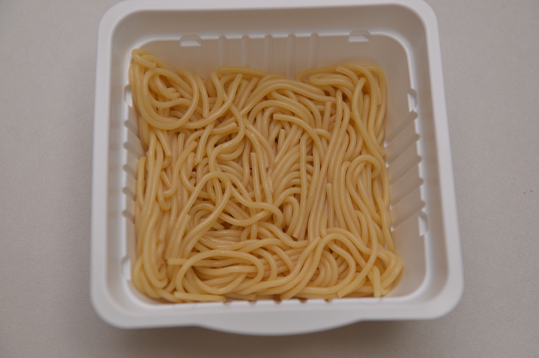 스파게티 소스를 얹은 잘 섞어서 포장지로 덮은 다음에 레인지에 1분 30초(1000W) 정도 돌리면 바로 먹을 수 있습니다. 용량이 적은 전자레인지는 2분 정도 돌리면 됩니다.